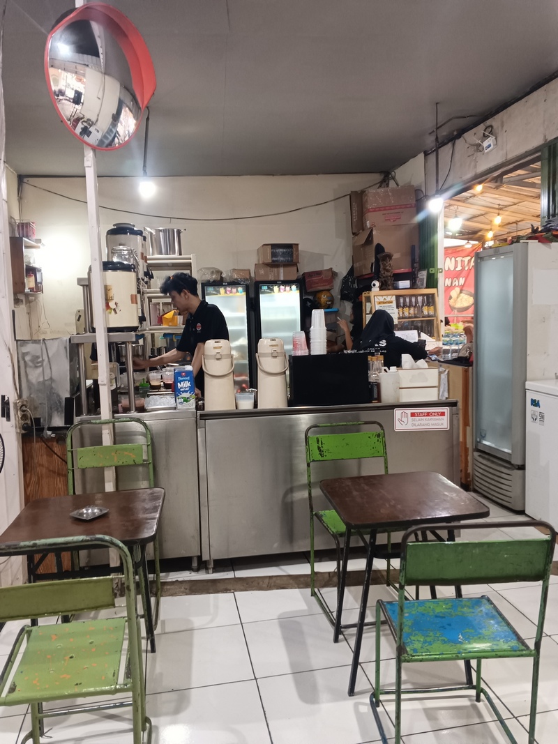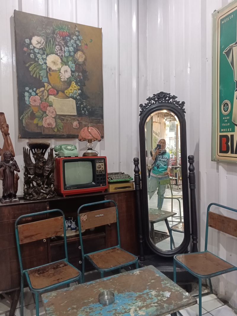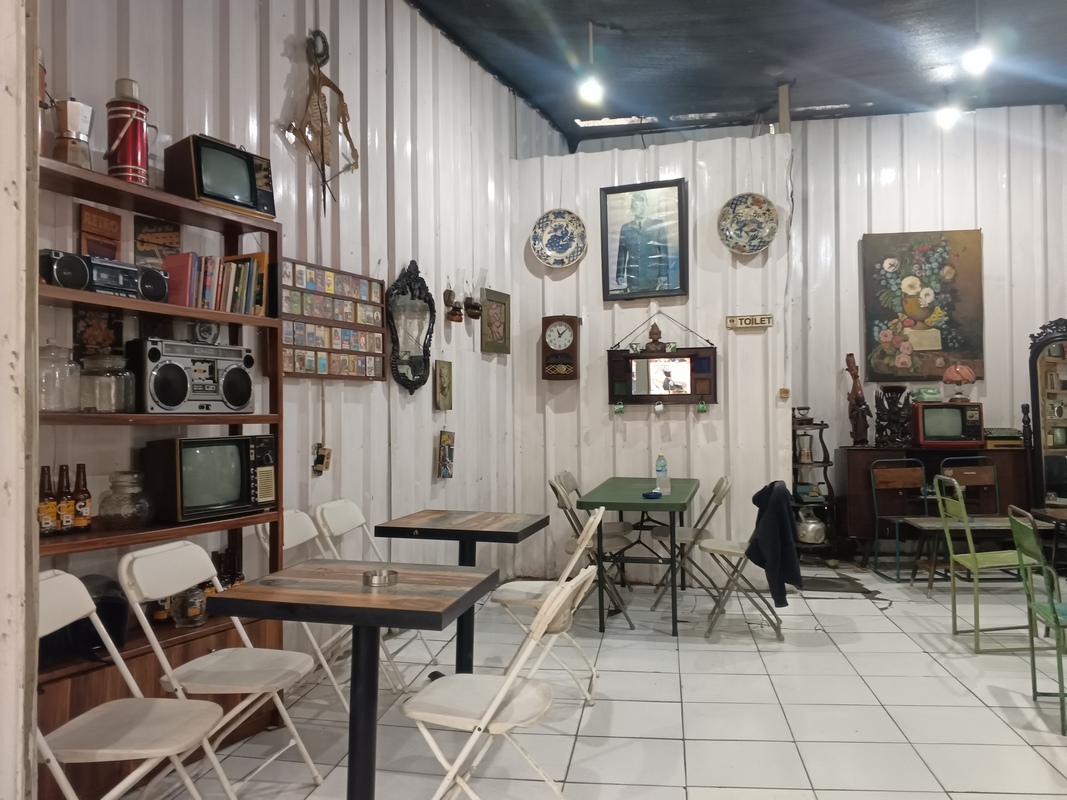 Begitu melangkah masuk, nuansa klasik langsung terasa, interiornya sederhana, dengan kursi jadul, meja lawas dan dekorasi yang mengingatkan pada warung kopi tempo doeloe. Dindingnya dihiasi poster-poster lama dan ornamen nya hiasan rak atau pernak pernik vintage yang membuat suasana semakin hidup. Disini waktu terasa berjalan lebih pelan, pas untuk melepas penat setelah aktivitas seharian.